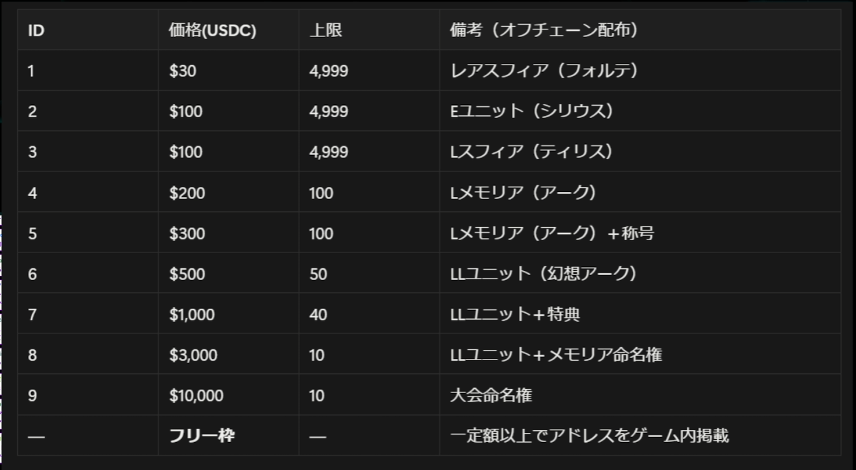 ID | 価格(USDC) | 上限 | 備考(オフチェーン配布) |