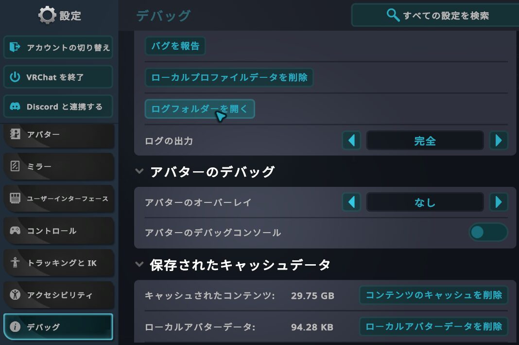 フォルダの場所はVRC内の設定からデバックの項目のログフォルダーを開くからも開けます。
