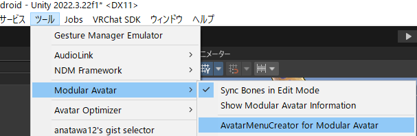 ツールからAvatarMenuCreator for Modular Avatarをクリック。