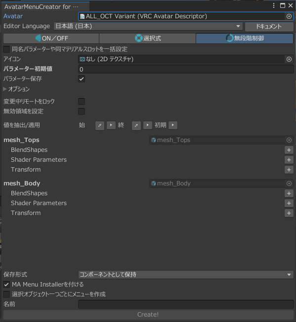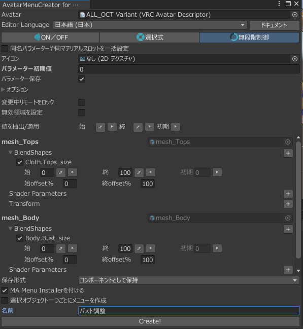 対象アバターを選択して、今回は無段階制御を選択。