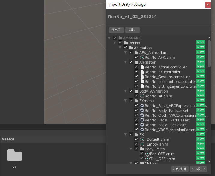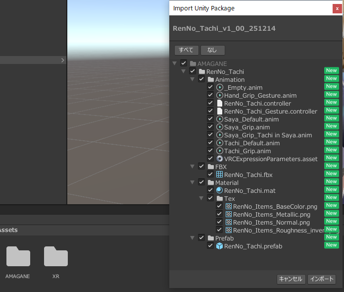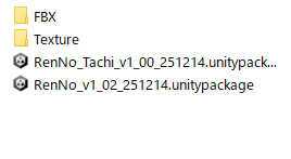 本体のデータ解凍時に同梱されていたRenNo_Tachi_v1_00_251214.unitypackageをインポートします。