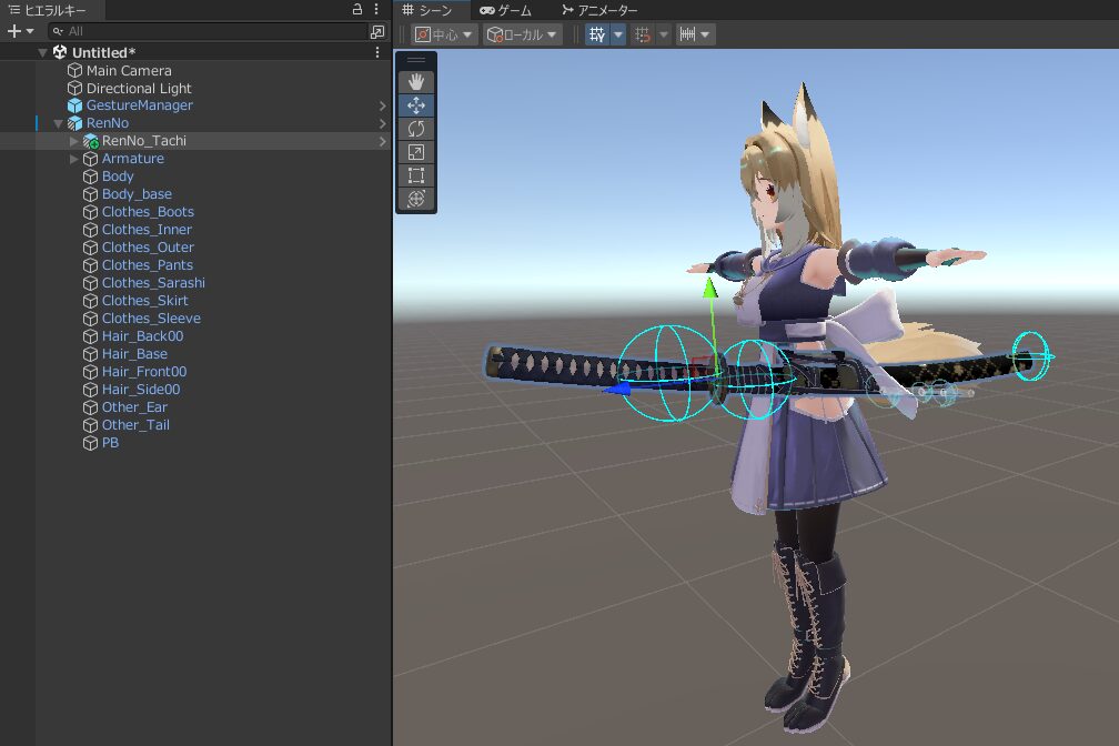 デフォルトでは左腰付近にセットアップされています。 位置を任意で動かし固定する場合には、Prefab内の「Armature_Tachi」を動かして調整してください。 Prefab自体を動かしてしまうと上手く握れなくなる可能性があります。